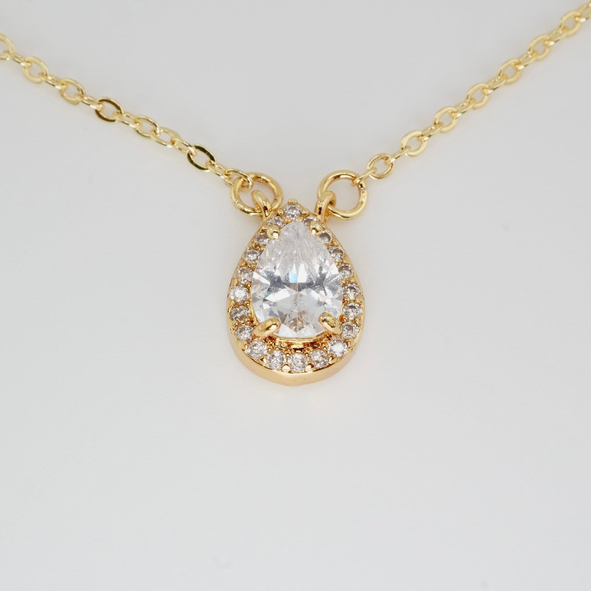 This exquisite piece features a stunning teardrop-shaped pendant adorned with sparkling cubic zirconia stones, surrounded by a delicate halo that catches the light beautifully. The pendant hangs gracefully from a fine gold chain, accented with additional shimmering stones to add an extra touch of luxury. Crafted from high-quality materials, this necklace exudes sophistication and timeless charm.