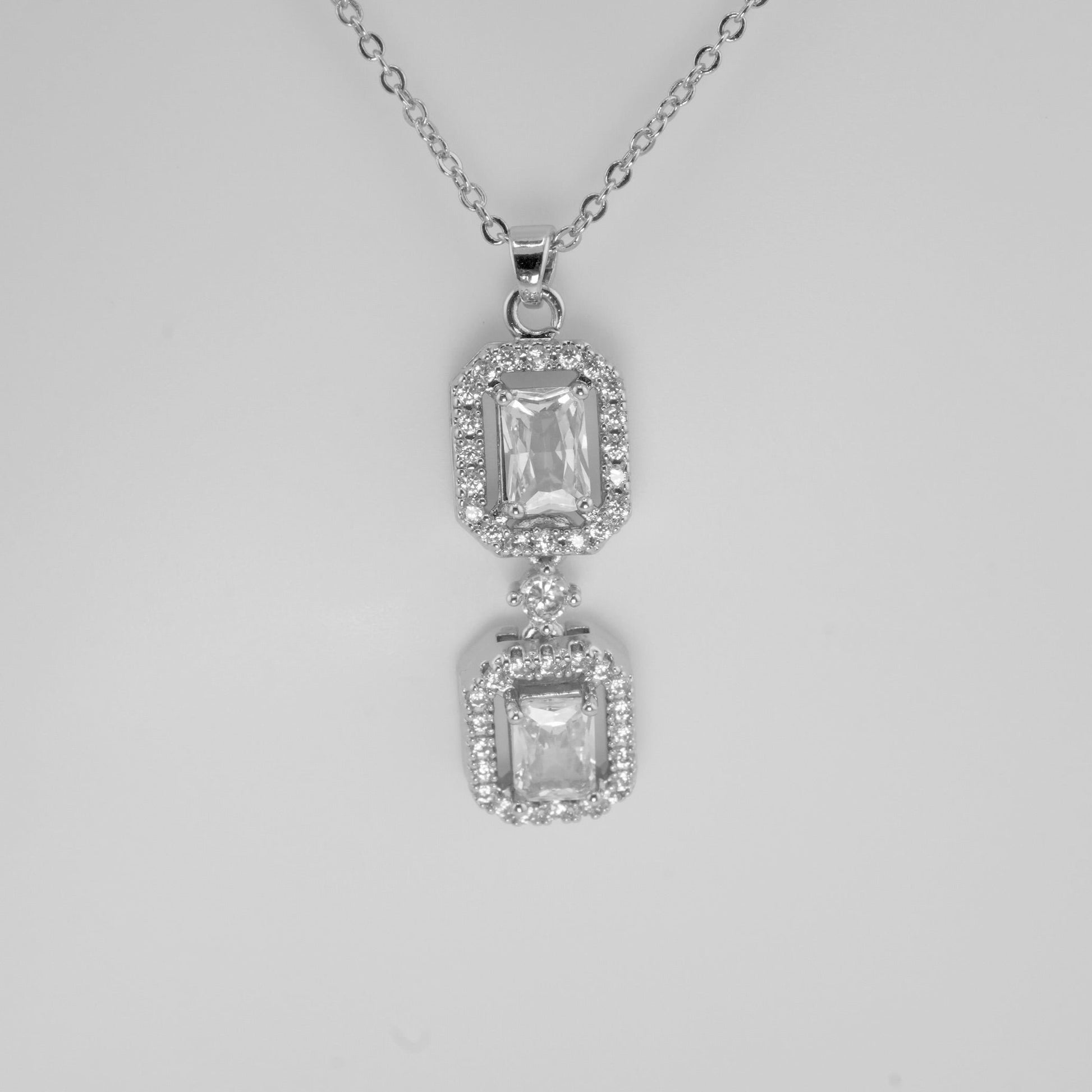 Embrace timeless elegance with the Double Radiance Silver Necklace. Featuring two exquisite rectangular stones set in sparkling halos of cubic zirconia, this piece exudes sophistication. The delicate silver chain enhances the necklace's luxurious feel, making it a versatile accessory perfect for both everyday wear and special occasions. Its radiant design captures light beautifully, offering a touch of glamour and refinement to any outfit.