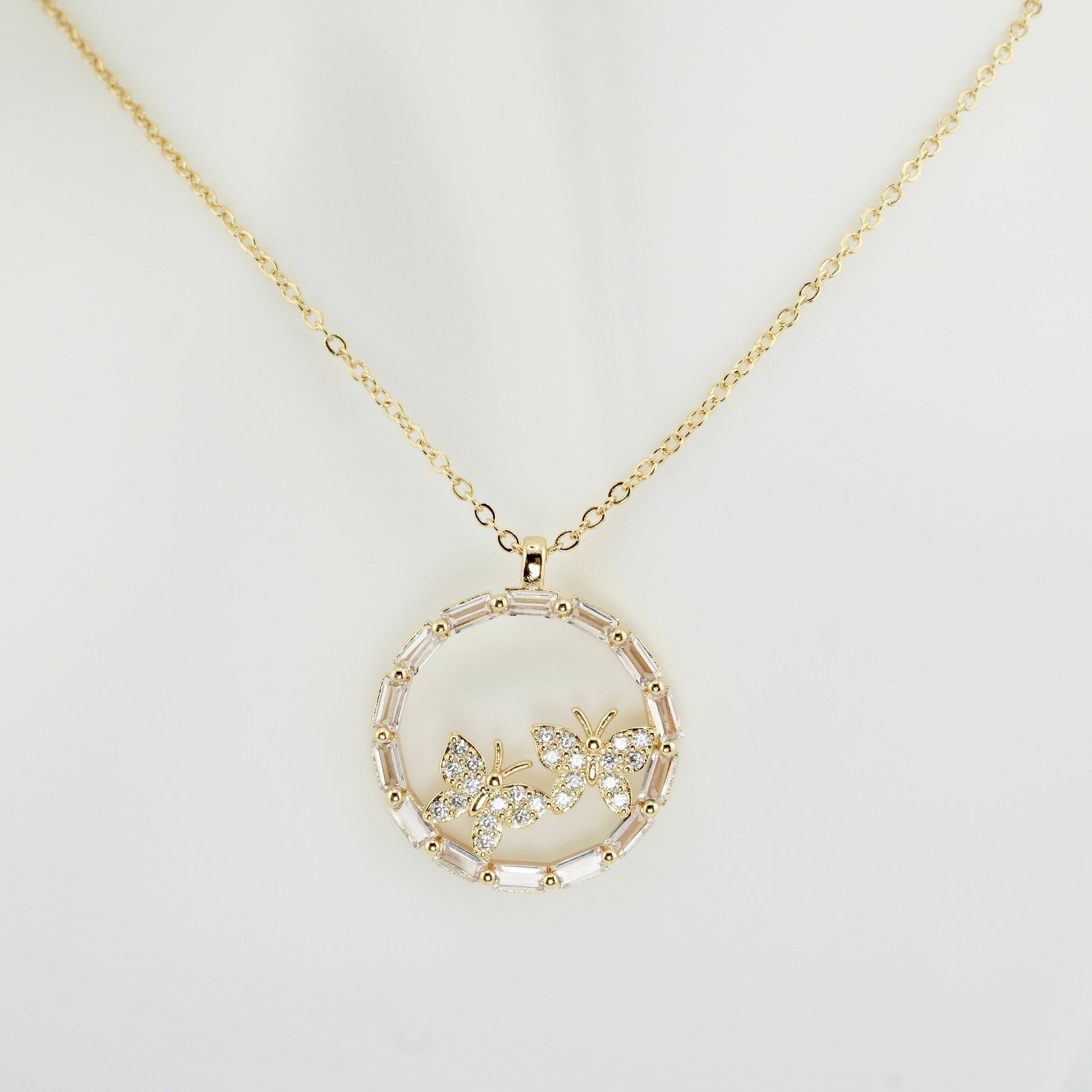 Elevate your style with the delicate beauty of the Enchanted Butterfly Necklace. Featuring two intricately detailed butterfly charms framed by a circle of dazzling baguette-cut stones, this necklace embodies a sense of elegance and wonder. Its timeless design is perfect for day-to-night transitions, making it an essential piece for those who appreciate subtle luxury and charm.