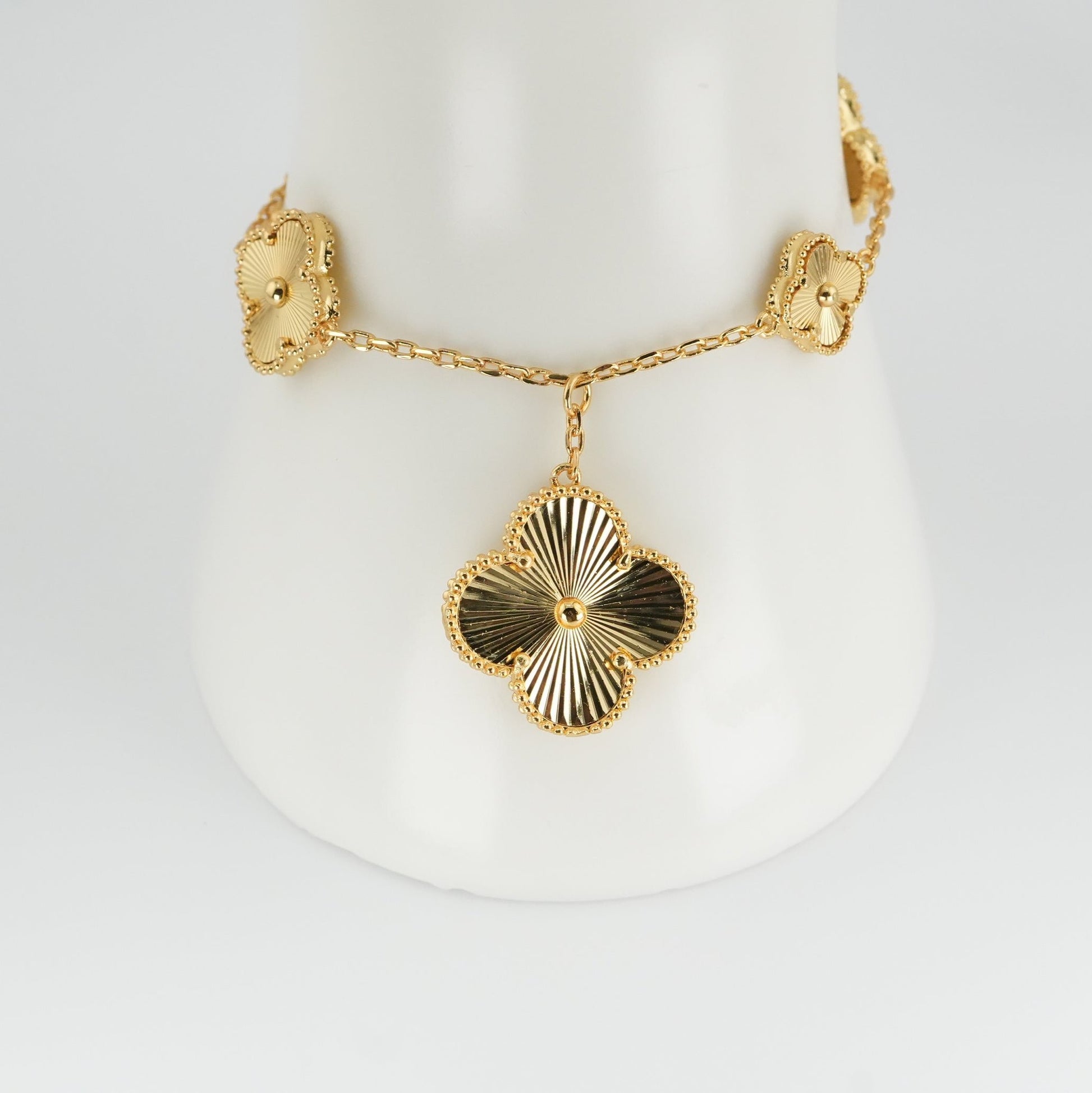 Embrace timeless elegance with our Golden Clover Charm Bracelet. Featuring a series of radiant clover-shaped charms, meticulously crafted in 21k gold plating, this bracelet exudes sophistication and grace. The delicate chain and intricate clover details make it a versatile piece perfect for both daily wear and special occasions. Waterproof, tarnish-proof, and hypoallergenic, this bracelet is designed to complement your style while ensuring long-lasting beauty. Add a touch of charm and luck to your collection with this stunning statement piece.