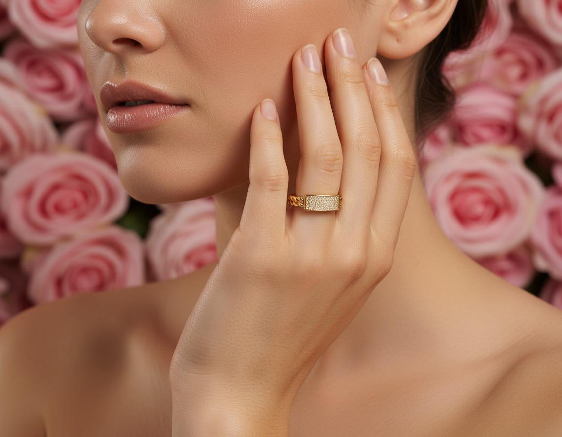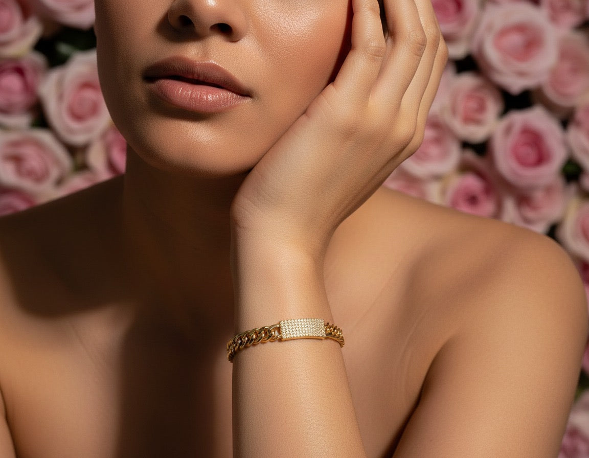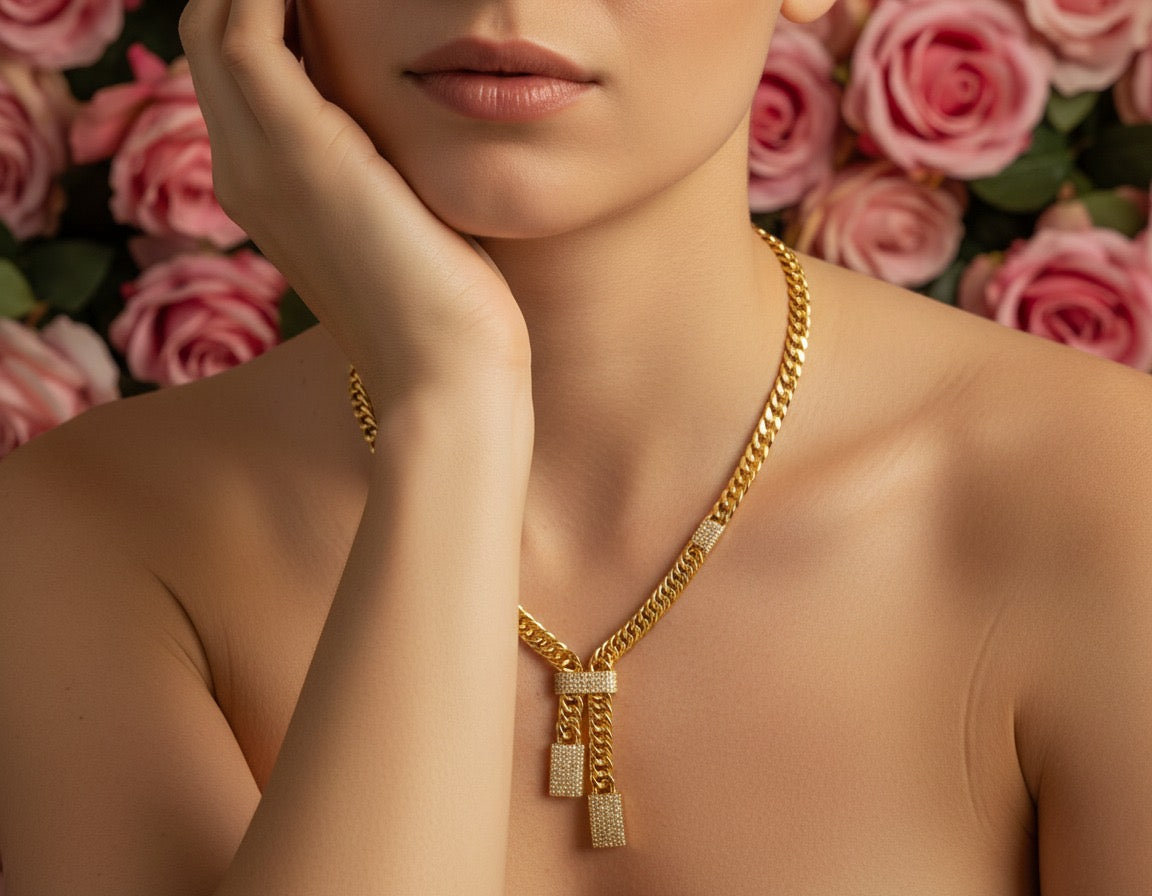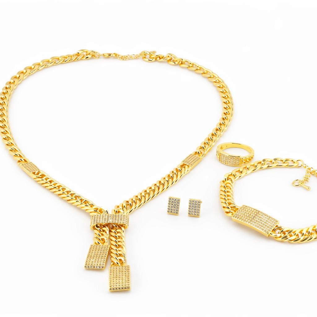 Elevate your look with our Golden Luxe Chain Set, a bold and glamorous collection designed to shine from every angle. This stunning 21K gold plated set features a thick Cuban-style chain necklace with a unique drop detail, paired perfectly with a matching bracelet, elegant stud earrings, and a sleek statement ring—each finished with sparkling crystal accents for a luxury feel.
