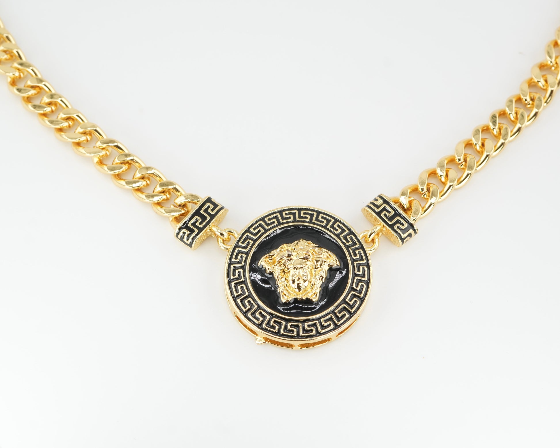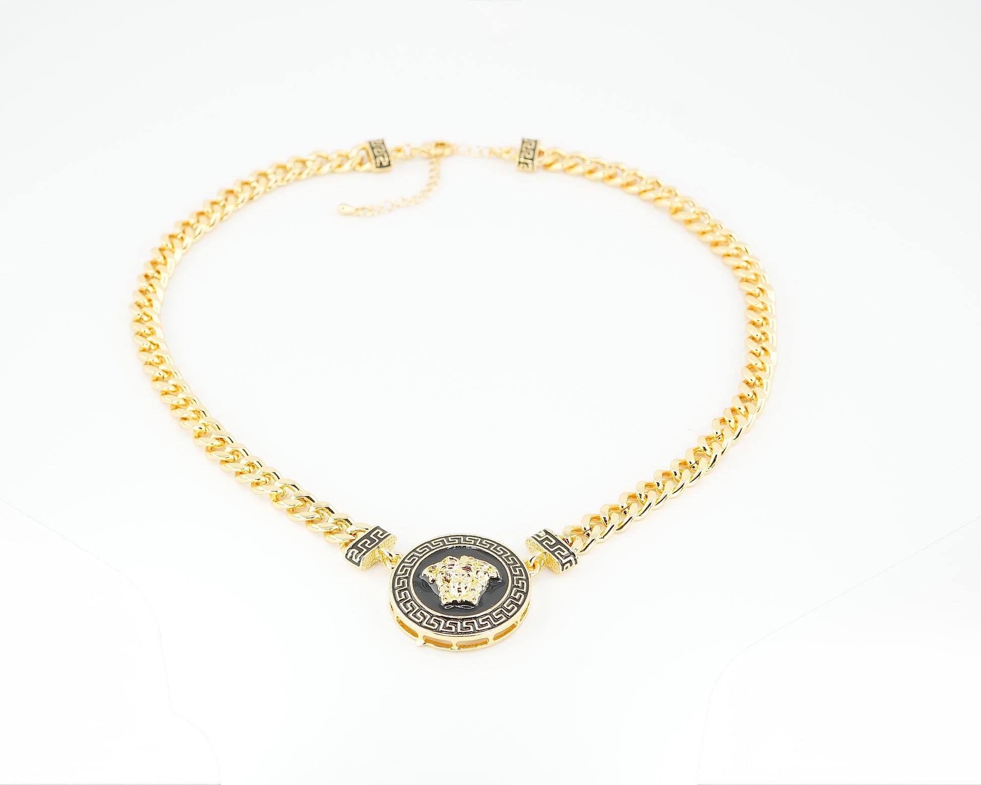 Elevate your style with the Regal Emblem Necklace, a luxurious piece that captures the essence of elegance and authority. Featuring a detailed emblem framed by intricate Grecian-inspired designs, this necklace is a striking blend of classic and modern elements. The bold gold-plated chain adds a touch of opulence, making it a perfect statement piece for any occasion. Whether worn alone or layered with other jewelry, this necklace offers a refined yet powerful finishing touch to your outfit.