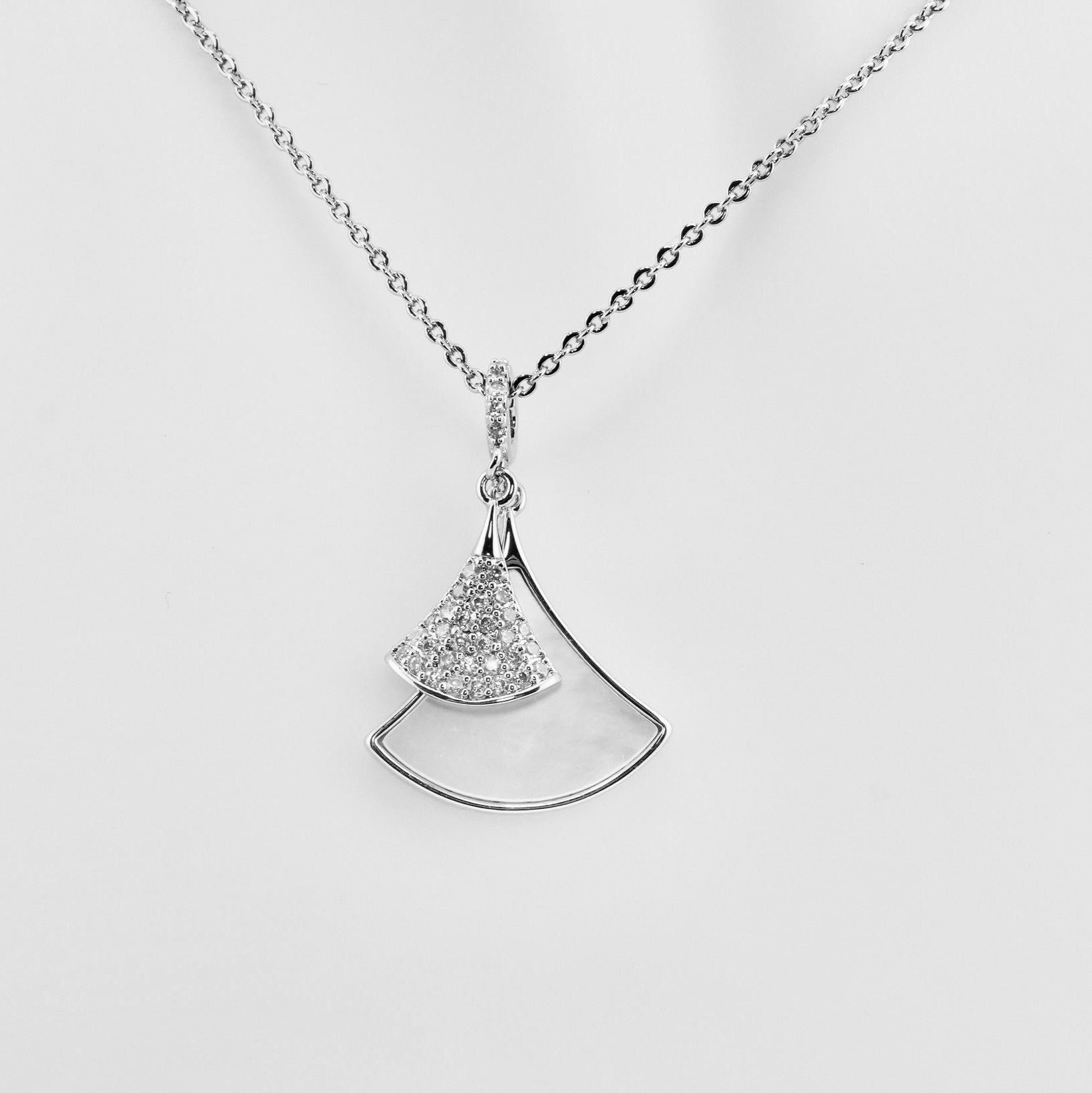 This stunning piece features a delicate fan-shaped pendant, adorned with shimmering cubic zirconia and a lustrous mother-of-pearl inlay. Crafted from high-quality sterling silver, this necklace exudes sophistication and timeless beauty. The pendant gracefully hangs from a fine chain, offering a versatile length that complements any neckline. Perfect for both everyday wear and special occasions, the Luminous Fan Pendant Necklace adds a refined sparkle to your jewelry collection. Treat yourself or a loved one to this exquisite accessory and let your style shine.