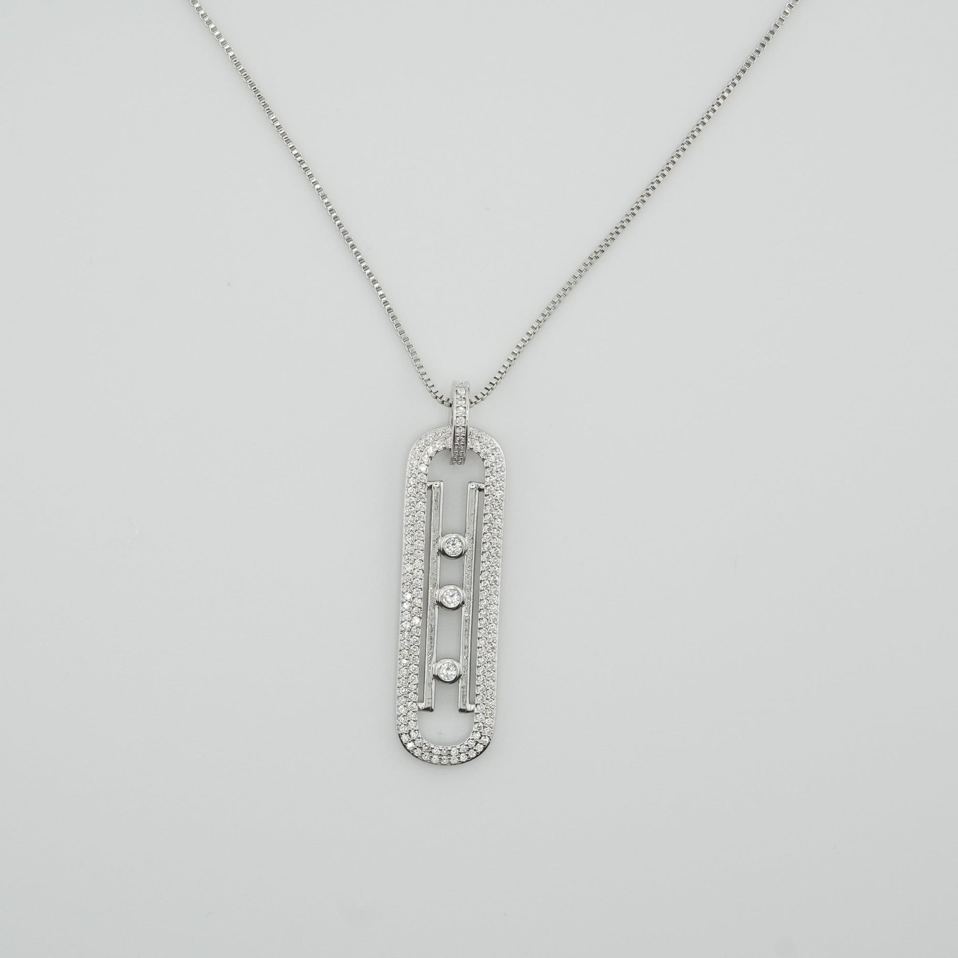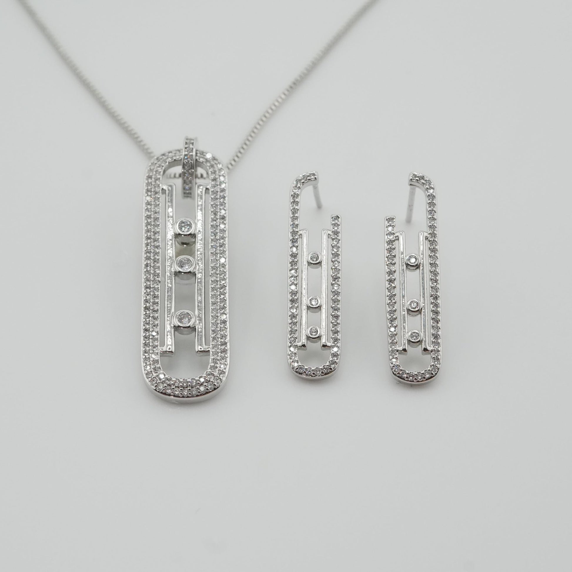 The Sleek Radiance Set, featuring a stunning silver necklace and matching earrings, is the epitome of contemporary elegance. This set showcases a modern design with a graceful elongated pendant and earrings, both adorned with rows of shimmering crystals. The central line of brilliant stones adds a touch of sparkle, perfectly complementing the sleek, streamlined silhouette. Ideal for making a statement of refined sophistication, this set is perfect for both everyday wear and special occasions, offering a timeless addition to any jewelry collection.